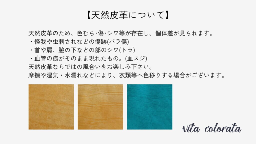 天然皮革のため、色むら・傷・シワ等が存在し、個体差が見られます。